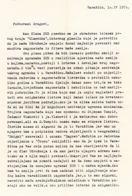 ću prenijeti pismo koje je EUB-u poslao tada mladi Varaždinac Boris Nazansky, član Enigmatskog udruženja Bjelovar praktički